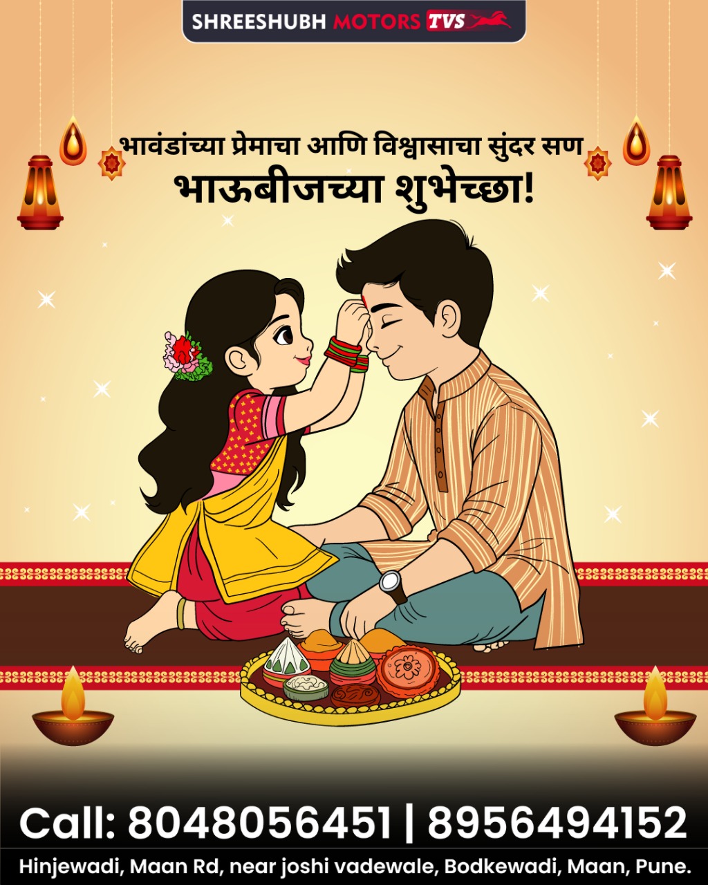 ποΈ Visit your nearest ShreeShubh TVS showroom in Maan, Hinjawadi, Baner, Balewadi, Bavdhan, and nearby areas for exciting Bhaubij festive offers on all TVS bikes and scooters β Apache, Jupiter, Raider, Ntorq, and more!